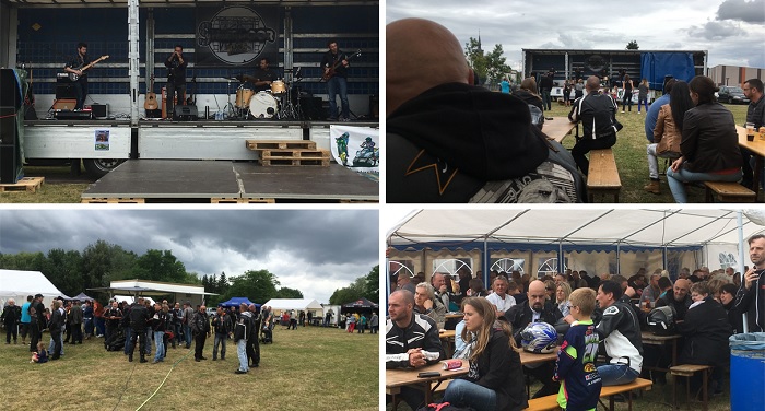 Le dimanche, alors que le ciel a mieux résisté, la fête a connu une certaine affluence. Mais le nombre de repas a tout de même été limité et plus d'un motard a hésité avant de sortir sa machine. Le beau concert de SHEEDOOR est tombé à point nommé pour réchauffer l'ambiance !