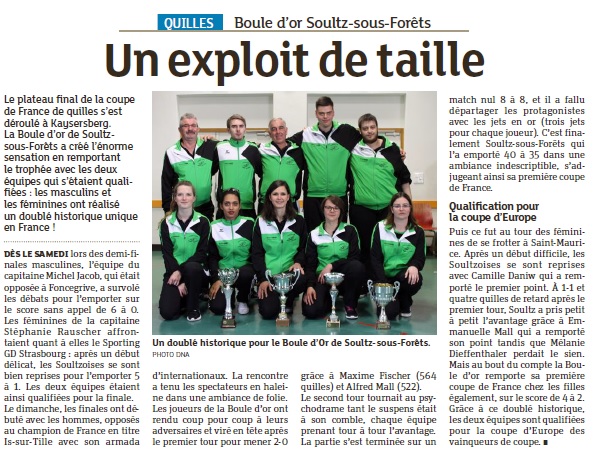 Le plateau final de la coupe de France de quilles a eu lieu ce week-end à Kaysersberg. Au final c'est la Boule d'Or de Soultz-sous-Forêts qui crée l'énorme sensation en remportant le trophée chez les masculins comme chez les féminines. Un doublé qu'aucun club n'a jamais réussi à ce jour.