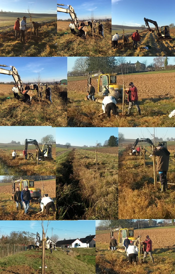 Dominique, Christophe, Fabrice, Fabien, Alfred,... et Pierre, ont oeuvré toute la matinée de samedi pour planter 30 arbres fruitiers sous la houlette de Eugène Walter, Président de l'association arboricole "La floraison" de Memmelshoffen. Cette opération s'inscrit dans le cadre de l'action "Life biocorridors" impulsée par le Parc Naturel Régional des Vosges du Nord et subventionnée par l'Union Européenne. Merci à l'entreprise Heiby qui a mis à disposition une pelleteuse, manoeuvrée avec dextérité par Fabien, sans laquelle cette opération aurait été beaucoup plus laborieuse. Merci à Anne, qui a accueilli "les travailleurs", autour d'une bonne table à midi : après l'effort, le réconfort ! Merci à tous !