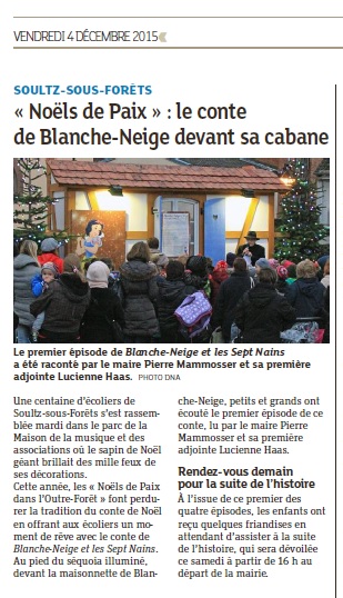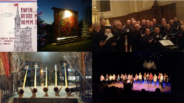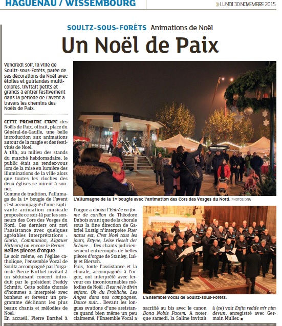 Vendredi soir, après une courte allocution du Maire, c'est au son des cors de l'ensemble des Cors des Vosges du Nord et des cloches de l'église protestante que la ville s'est embrasée de toutes ses illuminations de Noël et que la première bougie de l'Avent a été allumée. Tout le monde s'est retrouvé ensuite autour d'un vin chaud. La journée s'est achevée par un superbe concert de l'Ensemble Vocal de Soultz-sous-Forêts à l'église catholique. Samedi quelque 70 personnes ont assisté à la poignante projection de "Enfin redde m'r nimm devun" et sont entrées de plain-pied dans la thématique des "Noëls de Paix en Outre-Forêt". Enfin, le dimanche, le concert de fin de stage de "Chanter Noël à Soultz-sous-Forêts" a clos cette première séquence sur la route de Noël