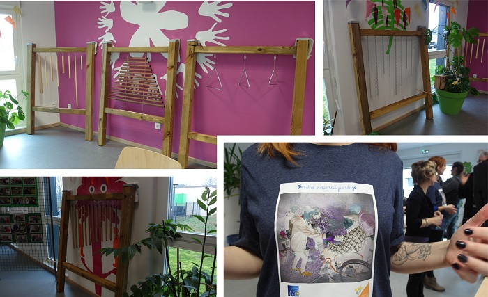 Dans la grande salle dévolue aux activités, de grands cadres en bois, sur lesquels s’accrochent des carillons de bois ou de métal, et des nichoirs à oiseaux aux couleurs vives, attendent de rejoindre leur place dans le jardin. Ces structures ont été réalisées par les résidents, dans le cadre d’ateliers dans lesquels se sont impliqués les jeunes de l'animation jeunesse,
